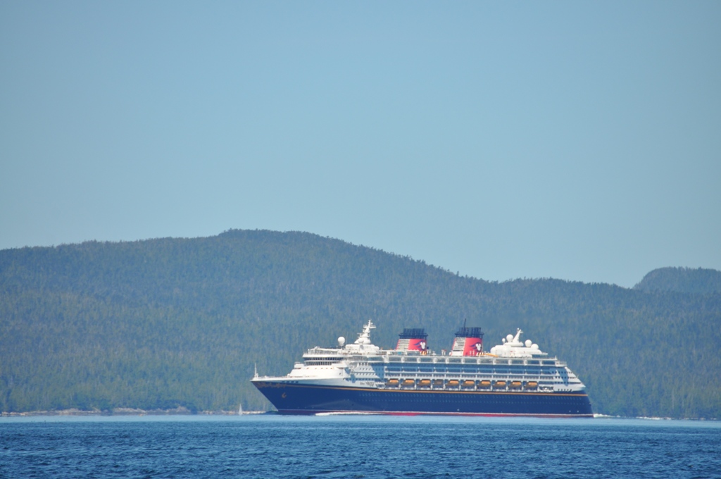 Continuing on we see a few white caps, but the water is definitely not rough. Ah, another cruise ship comes south – again this one is Disney Wonder, 294 meters long, and the one Kenny was on earlier in the month with his family. Ray radios us that we should ask him if he went below to fix the shear pin.