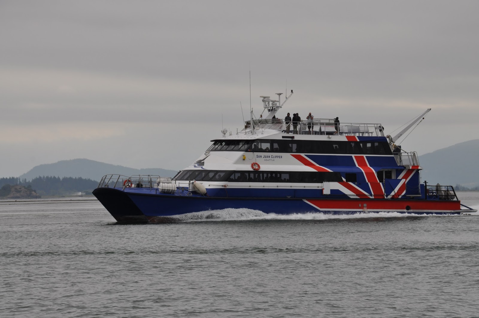 Oh, Wow! Not another one! Still in Skagit Bay, we see the San Juan Clipper coming toward us at 22 knots. Yep, another big wake. My, my! She is equally beautiful. The red, white and blue tug at my heart.
